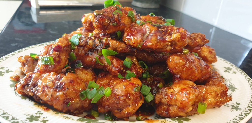 I love Korean food . There are so many delicious variations! Dakgangjeong is a big part of the Korean fried chicken culture, Dak means chicken in Korean. Gangjieong is a type of traditional Korean confectionery. most of the Korean people use boneless chicken or some of them use with bone . I am using with bone, chicken wings. Crispy sweet & spicy Korean chicken wings glazed in a sticky , sweet & spicy sauce. This recipe is delicious, yummy..& mouth melting!