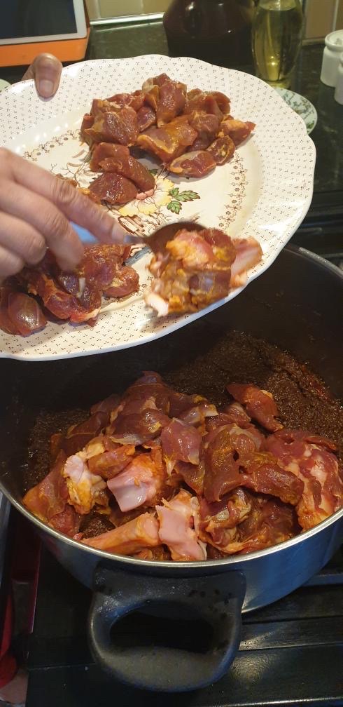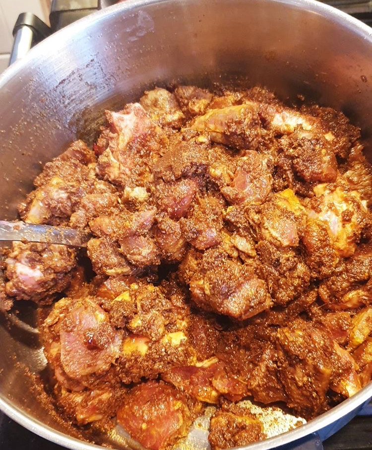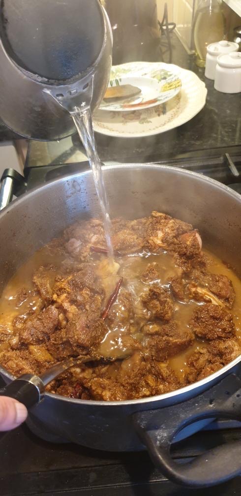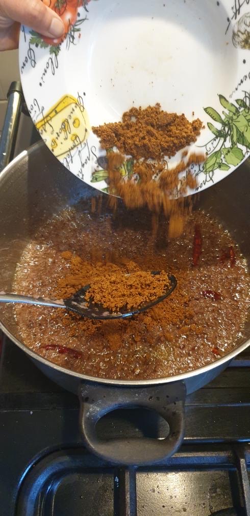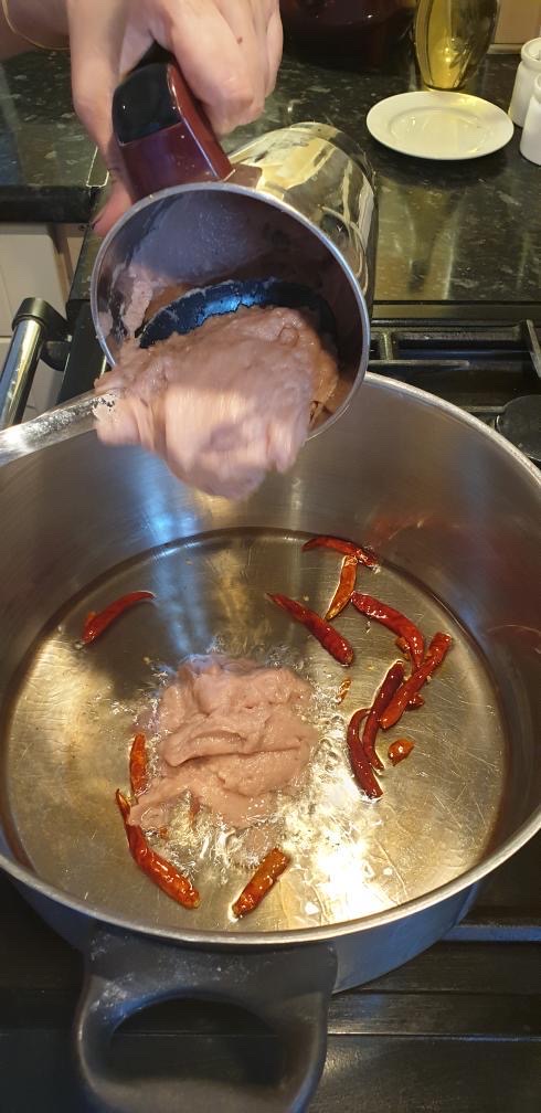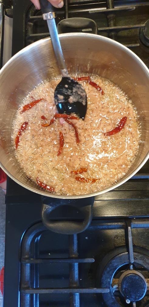 Add the whole mustered and whole cumin. When’s it crackle, add crushed chilli and garlic. Add some whole green chillis as well. Fry at list 1-2 minutes. Make sure don’t fry too much or burn the garlic and chilli. After 2 minutes add turmeric powder and salt. Mix them well and cover the lid for 10 minutes. When’s the water releases Add half cup of another water mix well and cover the lid cook at list half an hour.