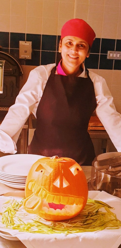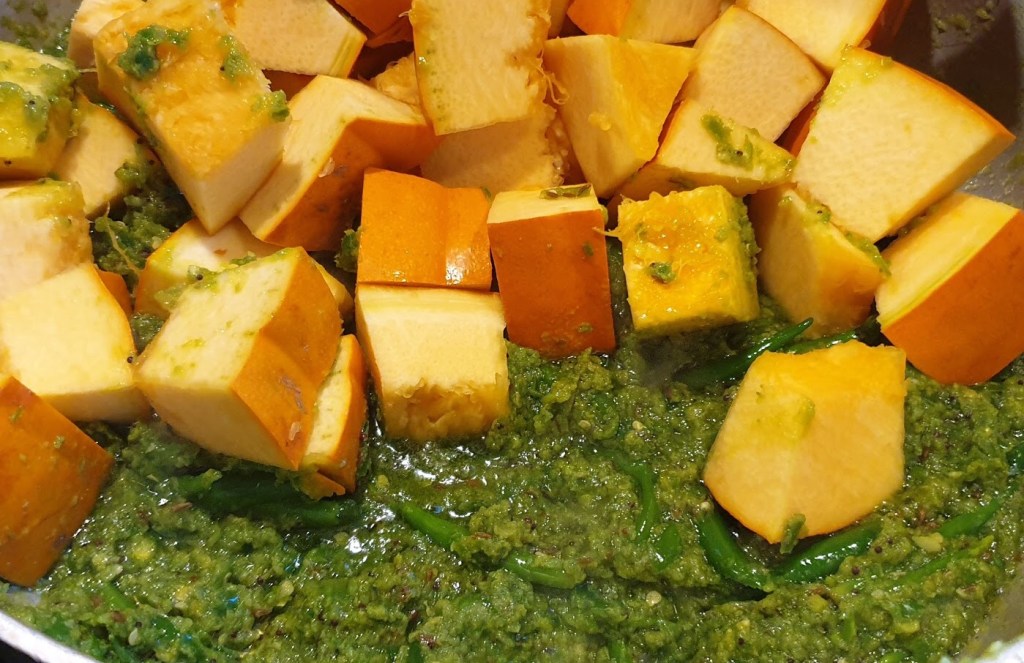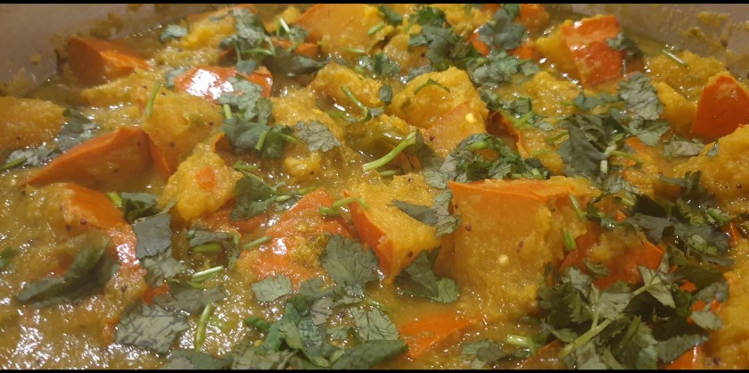 Pumpkins originated from Central America over 7,500 years ago. Now it’s all over the world. Seasonally, pumpkins are harvested in October. In the uk and US, pumpkins are best known for carving on halloween. However, you can also make many types of dishes from it; for example pumpkin soup, pumpkin pie and many more. In India, particularly in our village Pangra near Akola, we traditionally make spicy pumpkin bhaji every year for our festival, Dasara. This is not just for our family but we also make lots of pumpkin bhaji for all the villagers and invite them for dinner. This is called ‘Pangat’. Here we usually serve pumpkin bhaji, chapati, rice, dal and sweet. So I would like to share the recipe for our authentic, delicious Hot And Spicy Pumpkin Bhaji. I hope you enjoy it !!!